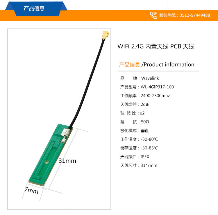 31*7mm WiFi 2.4G 內(nèi)置天線 PCB天線 帶IPEX接頭